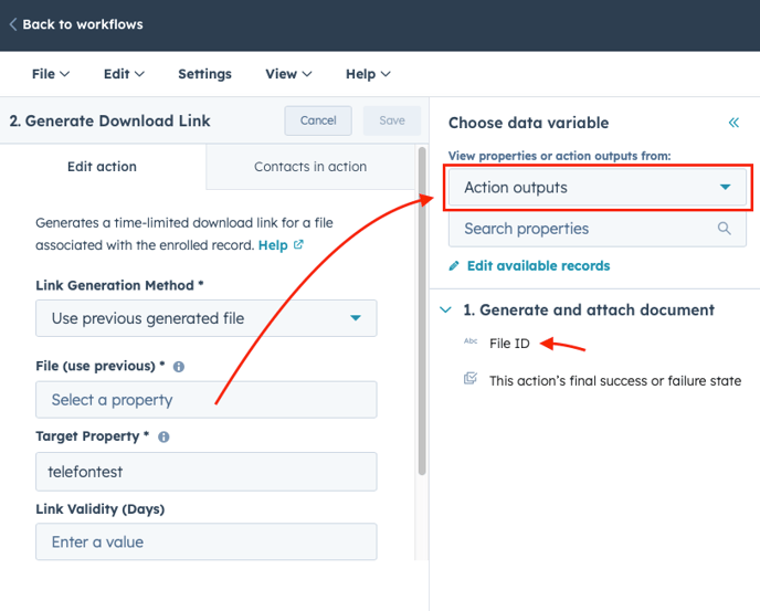 With the “Generate Download Link” action, you can automatically create a time-limited download link for a document in HubSpot Workflows.