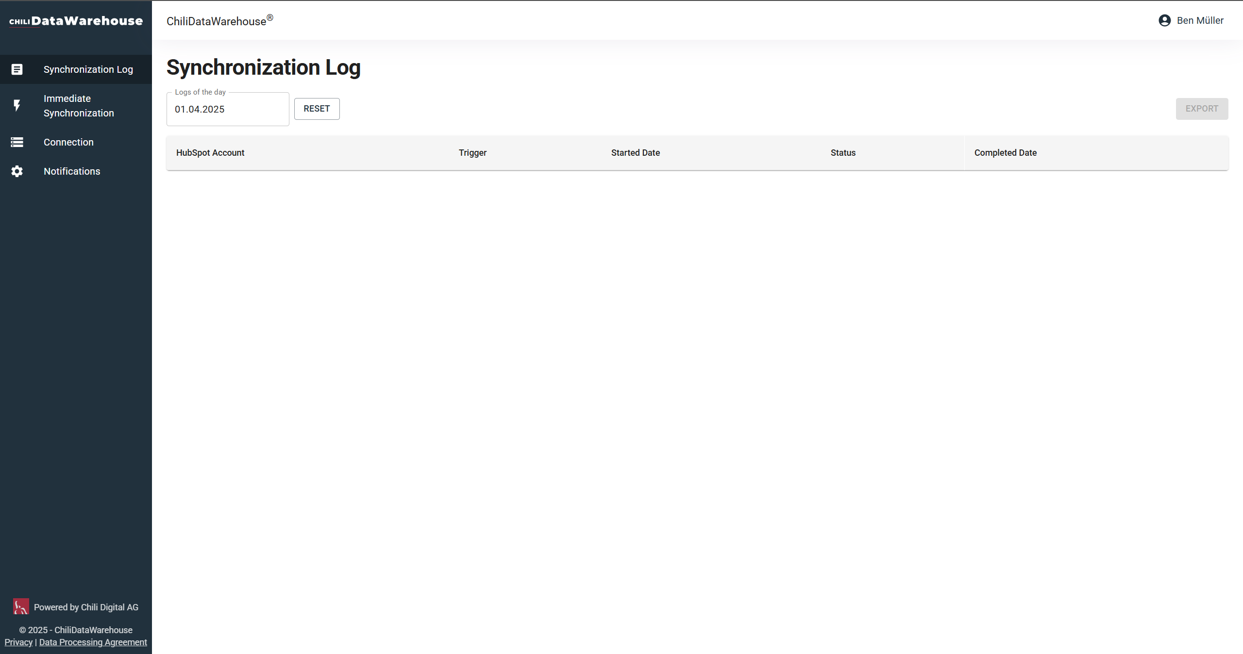 Eine Übersicht der Synchronisationsdaten (HubSpot Account, Trigger, Start- und Abschlusszeiten, Status) ermöglicht eine schnelle Diagnose und Nachverfolgung von Datenübertragungen.